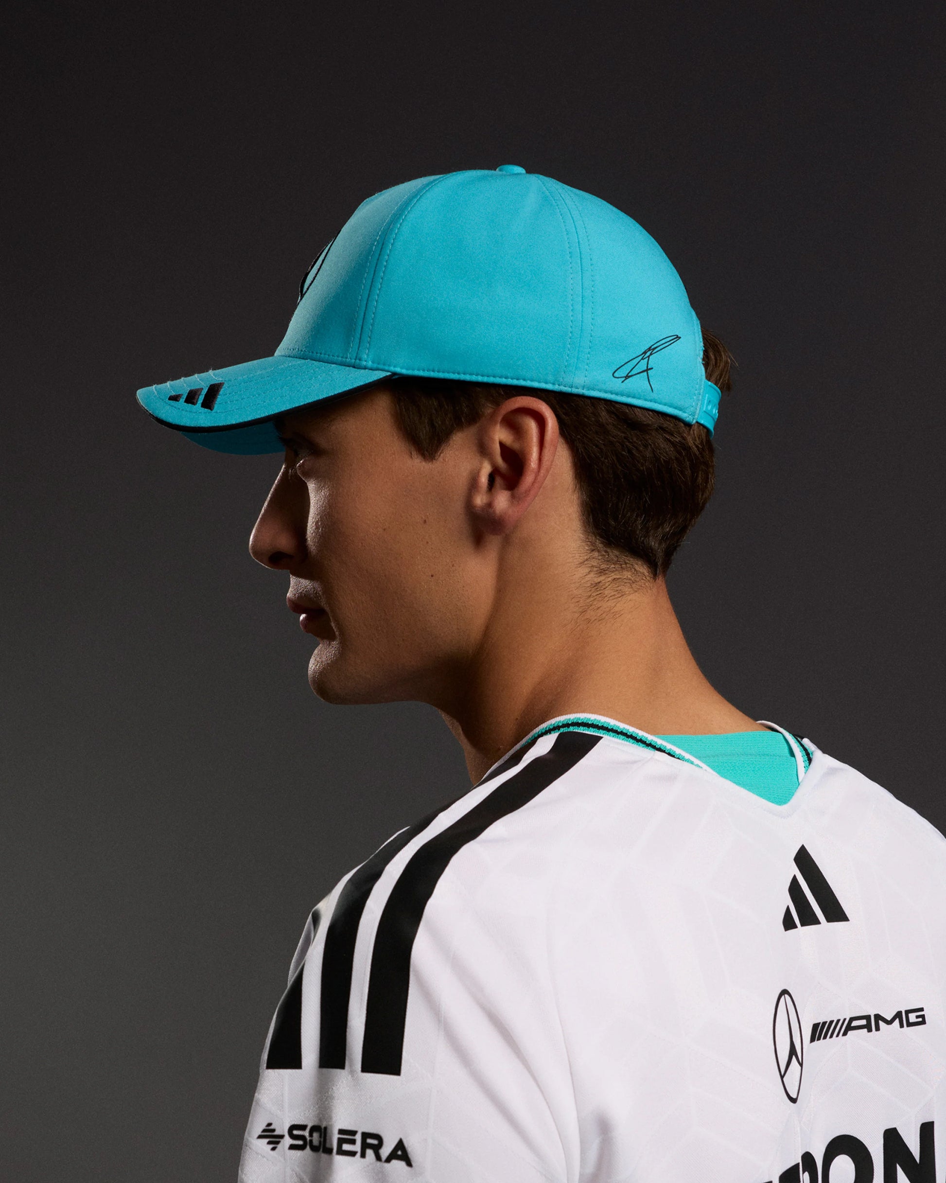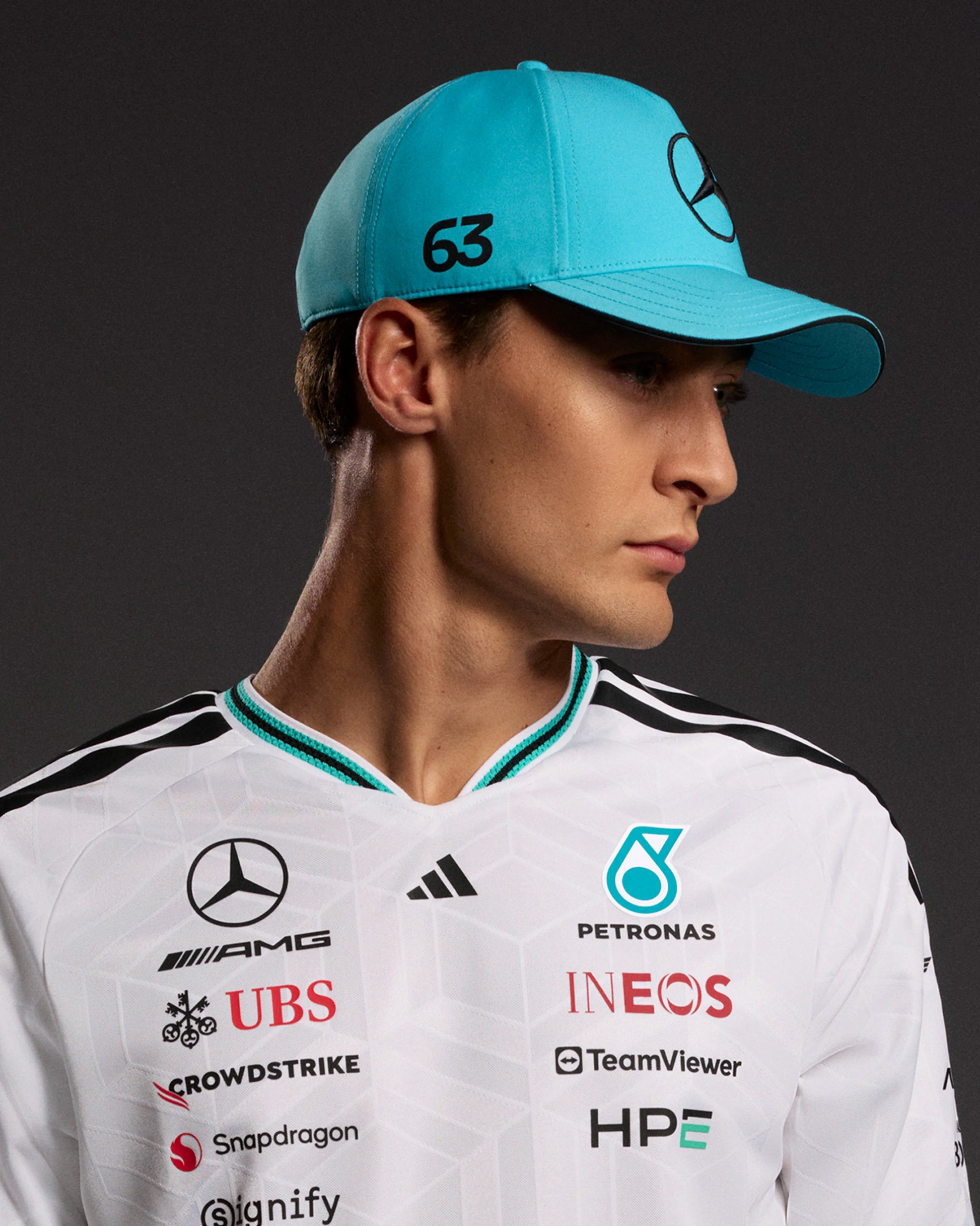 หมวกนักขับทีม Mercedes-AMG Petronas Formula One ประจำปี 2026 รุ่นของ George Russell จากแบรนด์พันธมิตรอย่างเป็นทางการของทีม คือ adidas Motorsport หมวกนี้มาพร้อมกับหมายเลขและลายเซ็นประจำตัวของ George Russell บริเวณข้างหมวก พร้อมด้วยโลโก้ของ Mercedes และ adidas